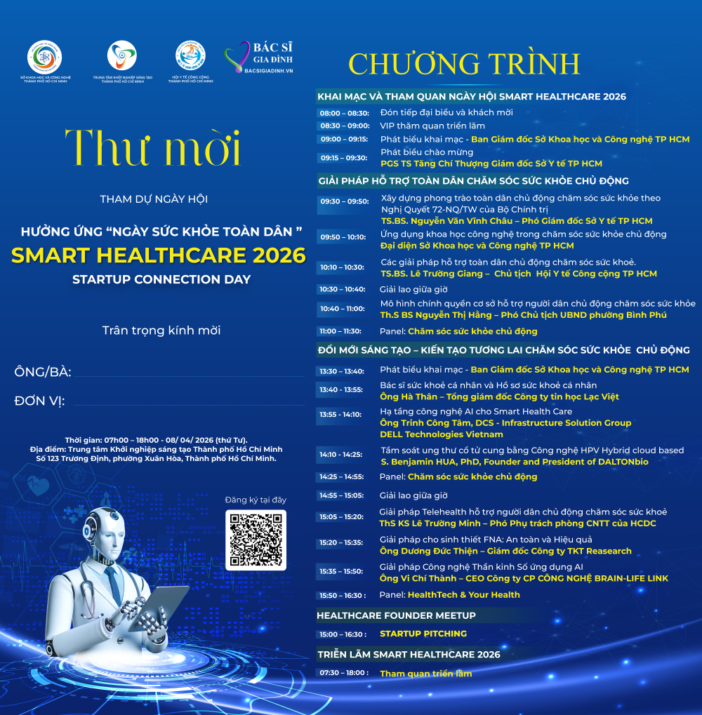 Sự kiện SMART HEALTHCARE 2026 - Startup Connection Day sẽ chính thức diễn ra vào ngày 08 tháng 4 năm 2026 tại Trung tâm Khởi nghiệp sáng tạo TP.HCM - SIHUB (số 123 Trương Định, phường Xuân Hòa, TP.HCM). Sự kiện được chỉ đạo bởi Sở Khoa học và Công nghệ TP.HCM cùng Sở Y tế TP.HCM, và do SIHUB, Hội Y tế Công cộng TP.HCM phối hợp cùng Công ty TNHH Chào Đại Việt - Bác Sĩ Gia Đình đồng tổ chức.